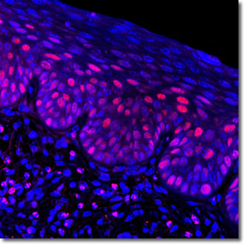 Los ratones transgénicos K14E7 tratados con estrógenos han sido ampliamente utilizados en nuestro laboratorio, y han emulado muchos de los biomarcadores ya descritos en pacientes tales como: p16, MCM-2 -7, Ki67, PCNA; pero de manera novedosa, B-catenina y Cldn-4.15,16 La vía de B-catenina está poco entendida en CC, pero se ha descrito posteriormente en pacientes, y se ha demostrado que tiene especial importancia en lesiones malignas cervicales.17,18 A continuación, se muestra un ejemplo del tipo de lesión en tejido ectocervical que generar este tipo de modelos, la imagen muestra una lesión de bajo grado y al marcador PCNA como biomarcador de células inmaduras.