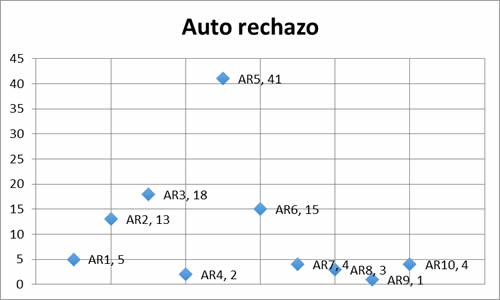 Las respuestas de los cuestionarios se agruparon en 10 rubros que van desde AR (auto rechazo) 1 al 10; del total de respuestas reportadas 97 (91.50%) fueron afirmativas a una sola pregunta; 8 (7.54%) tuvieron dos respuestas afirmativas y 1 (0.94%) a tres respuestas afirmativas; se agruparon de la siguiente forma de mayor a menor número de respuestas AR-5 con 46 (43.39%); AR-3 con 18 (16.98%); AR-6 con 15 (14.15%) AR-2 con 11 (10.37%); AR-1 con 4 (3.77%); AR-10 con 3 (2.83%); AR-4, AR-7 y AR-8 con 2 (1.88%) y finalmente AR-9 con 1 (0.94%). Gráfica 3.