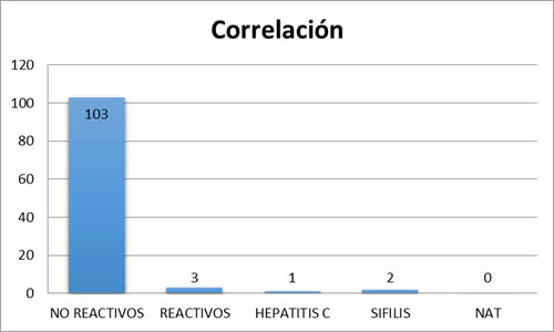 La negatividad de las pruebas de tamizaje en los donantes a pesar de respuestas afirmativas a factores de riesgo es muy alta con hasta el 97.16 %; lo cual deja solamente a una reactividad para sífilis y hepatitis C del 2.84%; En Treponema pallidum se detectó nuevamente reactividad por lo que se llegó hasta las pruebas confirmatorias dándonos resultados verdaderos positivos en ambos pacientes y una prevalencia del 0.15.