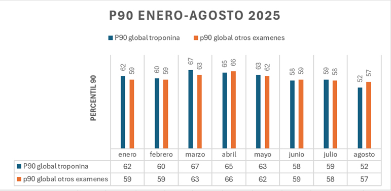 Estudio descriptivo, retrospectivo realizado con todas las determinaciones de Troponina procesadas en el laboratorio en equipo COBAS 6000 Y COBAS PRO entre enero ay agosto de 2025, los datos fueron extraídos desde el sistema informático de laboratorio. Se calculó: el porcentaje de cumplimiento del tiempo de respuesta de resultados de troponina (TAT) <60 min; percentil 90 (P90). Se consideró como referencia un umbral de >=90% de cumplimiento en el indicador de TAT y un P90 <=60 min. Para evaluar si el TAT de troponina es un indicador representativo del desempeño global del Laboratorio para otros exámenes urgentes con TAT <60 min se seleccionaron del total de prestaciones aquellas que tienen un tiempo de respuesta declarado <60 min y se calculó el porcentaje de cumplimiento y P90 del TAT de estas prestaciones. Se consideró como referencia un umbral de >=90% de cumplimiento en el indicador de TAT y un P90 <=60 min. Como herramienta de análisis para la aplicación de intervenciones se utilizó el Diagrama de Ishikawa para detectar causas de incumplimiento y aplicar acciones de mejora, agrupando en causa relacionadas a: procesos, recurso humano y equipamiento.