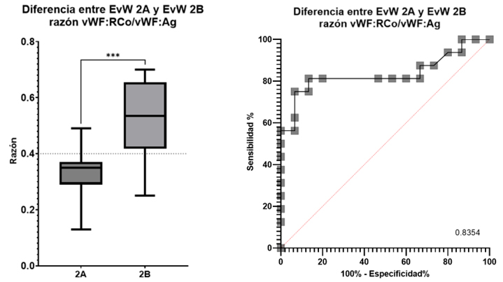 Durante el periodo definido 898 pacientes fueron diagnosticados con EvW. De estos un 43% (386) fueron clasificados como low EvW, 49.1% (441) como tipo 1, 2.45% (22) como tipo 2A, 3.34% (30) como tipo 2B, 1.11% (10) tipo 2N, 0.45% (4) como tipo 3 y 0.55% (5) como adquirido. Para vWF:RCo/vWF:Ag en el grupo 2A, se obtuvo una media de 0.33±0.09, una mediana de 0.35, con una razón mínima de 0.13 y la máxima de 0.49. Para el grupo 2B, se obtuvo una media de 0.52±0.15, una mediana de 0.54; la razón mínima fue de 0.25 y la máxima de 0.7. Al comparar ambos grupos, hay diferencia estadística significativa (p≤0.001). Para la diferenciación entre ambos subgrupos, se generó una curva ROC, resultando el punto de corte óptimo una razón de 0.4 con un área bajo la curva (AUC) de 0.84, destacando una sensibilidad de 81.25%, una especificidad de 86.67%. Para vWF:CB/vWF:Ag del grupo 2A, se obtuvo una media de 0.25±0.12, una mediana de 0.26; la razón mínima fue de 0.04 y la máxima de 0.44. Para el grupo 2B, se obtuvo una media de 0.48±0.18, una mediana de 0.49; la razón mínima fue de 0.2 y la máxima de 0.8. Al comparar ambos grupos, hay diferencia estadística significativa (p≤0.001). Por otro lado, utilizando la razón vWF:CB/vWF:Ag el punto de corte óptimo fue de 0.34 con un AUC de 0.85. Para este punto de corte la sensibilidad fue de 75% y la especificidad de 84.62%.