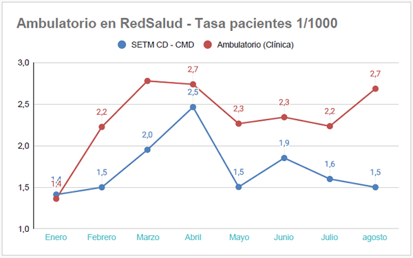En cuanto al origen de las muestras rechazadas, el área de Hospitalizados presentó el mayor número de rechazos (1.407), seguida por Ambulatorio CMD (1.499) y Urgencia (855). Las muestras de Ambulatorio Clínica fueron las que menos rechazos registraron (956). El indicador general de rechazo para toda la red fue de 0,72% para las muestras de Urgencia y 0,56% para las de Hospitalizado, mientras que Ambulatorio CMD tuvo un indicador de 0,06% y Ambulatorio Clínica de 0,09%. A nivel de filiales, la tasa de rechazo por cada 1.000 muestras reveló diferencias significativas. CRS Rancagua presentó la tasa de rechazo más alta en el ámbito de Urgencia con 17,26 rechazos por cada 1.000 muestras, y en el ámbito de Hospitalizado con 12,23. Por otro lado, la filial con la menor tasa de rechazo en Urgencia fue CRS Santiago (2,34) y en Hospitalizado fue CRS Vitacura (2,97).