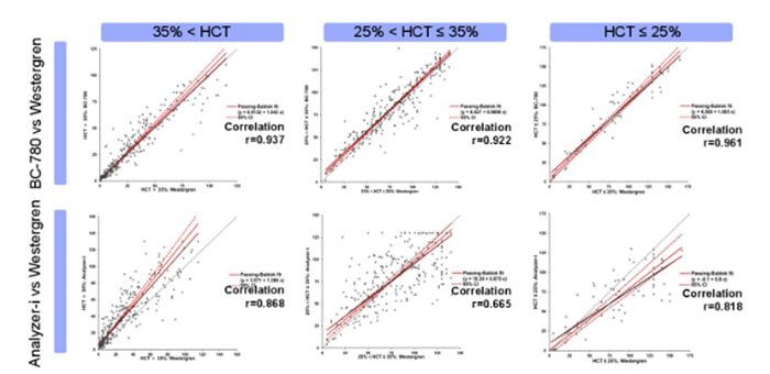 El análisis PB-A mostró que la VHS detectada por el BC-780 tuvo una buena correlación con los resultados obtenidos por el método Westergren (y = 1.748 + 1.026x, r = 0.958), mientras que el coeficiente de correlación entre los resultados del Analyzer-i y el método Westergren fue 0.815.