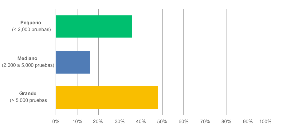 Muchas de las aplicaciones aún están en proceso y los resultados no se han publicado, lo que se sabe, de acuerdo a una encuesta electrónica realizada por un servidor y que incluyó a 270 laboratorios en México, es que éste recurso de la IA lo utiliza el 50% en los grandes laboratorios, los cuales procesan más de 5,000 pruebas al mes. (Gráfica 1)