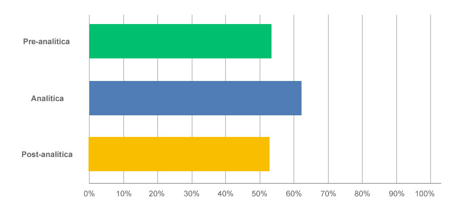 El otro dato interesante, producto de la encuesta, es que el 65% de los laboratorios utiliza la herramienta en diferentes actividades de la etapa analítica, seguida de la etapa preanalítica y postanalítica en las mismas proporciones. Gráfica 2.