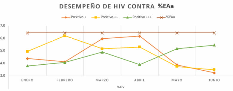 Una vez obtenidos los datos, se evaluó el desempeño analítico mensual durante el primer semestre del año, se comparó el %EAa contra el %CV obtenido del CCI en cada marcador de manera mensual durante el lapso estipulado. En la Tabla 7 se muestra el conjunto de los datos obtenidos para el marcador de HIV, donde se aprecia que todos los %CV son menores que el %EAa, dando como aprobado este desempeño. En la Figura 1 se ejemplifica la evaluación de manera visual de los datos representados en la Tabla 7.