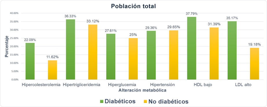 FIGURA 3: Prevalencia de alteraciones metabólicas en pacientes diabéticos vs no diabéticos del total de la población.