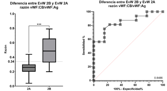 Durante el periodo definido 898 pacientes fueron diagnosticados con EvW. De estos un 43% (386) fueron clasificados como low EvW, 49.1% (441) como tipo 1, 2.45% (22) como tipo 2A, 3.34% (30) como tipo 2B, 1.11% (10) tipo 2N, 0.45% (4) como tipo 3 y 0.55% (5) como adquirido. Para vWF:RCo/vWF:Ag en el grupo 2A, se obtuvo una media de 0.33±0.09, una mediana de 0.35, con una razón mínima de 0.13 y la máxima de 0.49. Para el grupo 2B, se obtuvo una media de 0.52±0.15, una mediana de 0.54; la razón mínima fue de 0.25 y la máxima de 0.7. Al comparar ambos grupos, hay diferencia estadística significativa (p≤0.001). Para la diferenciación entre ambos subgrupos, se generó una curva ROC, resultando el punto de corte óptimo una razón de 0.4 con un área bajo la curva (AUC) de 0.84, destacando una sensibilidad de 81.25%, una especificidad de 86.67%. Para vWF:CB/vWF:Ag del grupo 2A, se obtuvo una media de 0.25±0.12, una mediana de 0.26; la razón mínima fue de 0.04 y la máxima de 0.44. Para el grupo 2B, se obtuvo una media de 0.48±0.18, una mediana de 0.49; la razón mínima fue de 0.2 y la máxima de 0.8. Al comparar ambos grupos, hay diferencia estadística significativa (p≤0.001). Por otro lado, utilizando la razón vWF:CB/vWF:Ag el punto de corte óptimo fue de 0.34 con un AUC de 0.85. Para este punto de corte la sensibilidad fue de 75% y la especificidad de 84.62%.