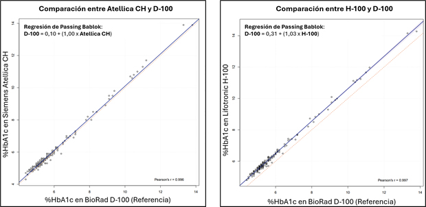 Del total de muestras analizadas, tres presentaron valores superiores a 14% de HbA1c. Estos fueron reportados como valores numéricos por los equipos D-100 y H-100 Plus, mientras que Atellica CH los clasificó como “mayor a 14”, lo que impidió su comparación directa y justificó su exclusión del análisis estadístico. En las 184 muestras restantes, se observó una correlación muy alta con el equipo de referencia D-100 (coeficiente de Pearson > 0,996 en ambos casos). La regresión de Passing-Bablok no mostró diferencias significativas entre D-100 y Atellica CH, pero sí evidenció un sesgo sistemático en H- 100 Plus, que sobreestimó los valores de HbA1c (intercepto = +0,31%; IC95%: 0,18–0,44; P < 0,05). Las medianas fueron de 5,3% para D-100, 5,4% para Atellica CH y 5,7% para H-100 Plus. En cuanto a la clasificación clínica (normal, prediabetes, diabetes), Atellica CH fue concordante en un 95,1% con D-100, mientras que H-100 Plus alcanzó solo un 63,6%. Sin embargo, si se aplicara el ajuste de pendiente e intercepto obtenido por regresión de Passing-Bablok, la concordancia de H-100 Plus podría aumentar teóricamente a 95,7%.