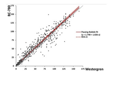 El análisis PB-A mostró que la VHS detectada por el BC-780 tuvo una buena correlación con los resultados obtenidos por el método Westergren (y = 1.748 + 1.026x, r = 0.958), mientras que el coeficiente de correlación entre los resultados del Analyzer-i y el método Westergren fue 0.815.